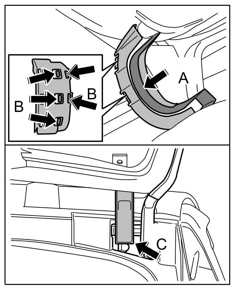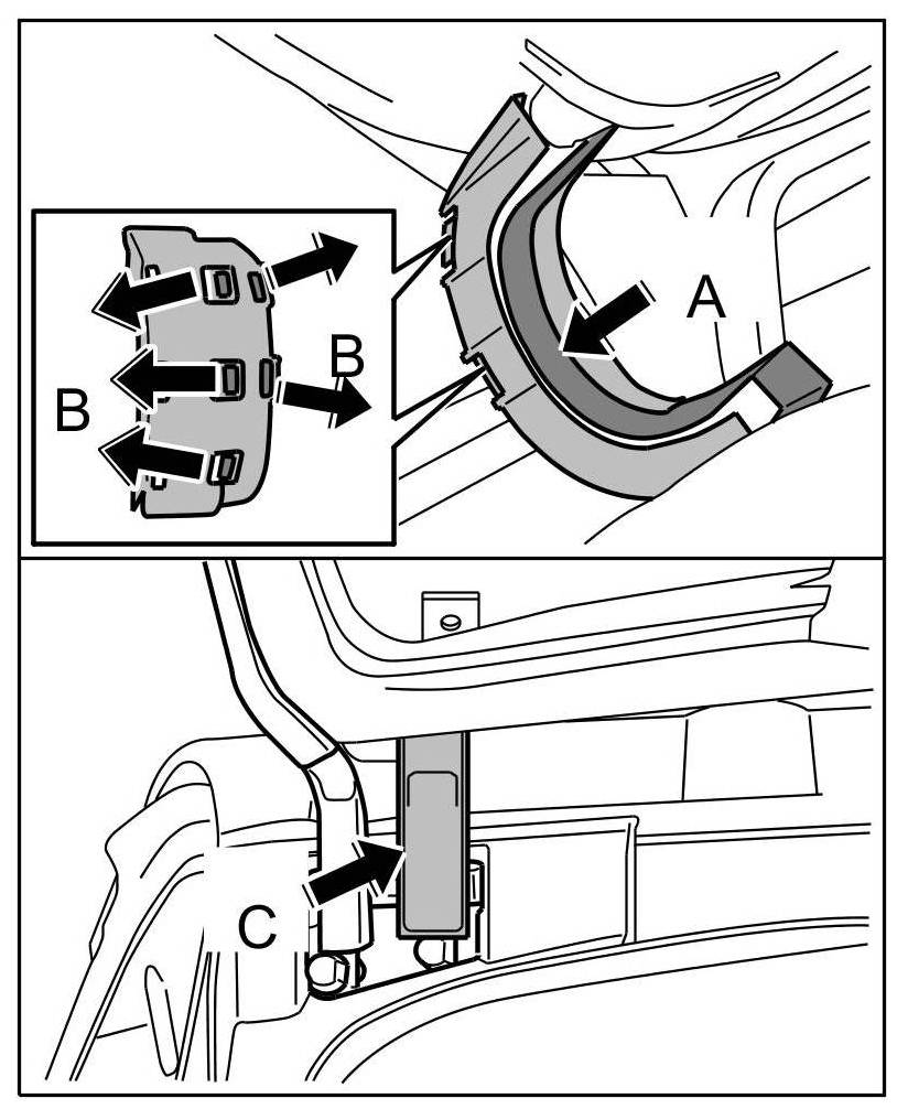 12. Push wiring duct onto hinge -arrow C- until locking tabs are felt to engage.