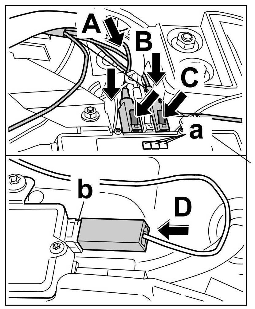 18. Push connector onto white connection -b- of right antenna amplifier -arrow D-.