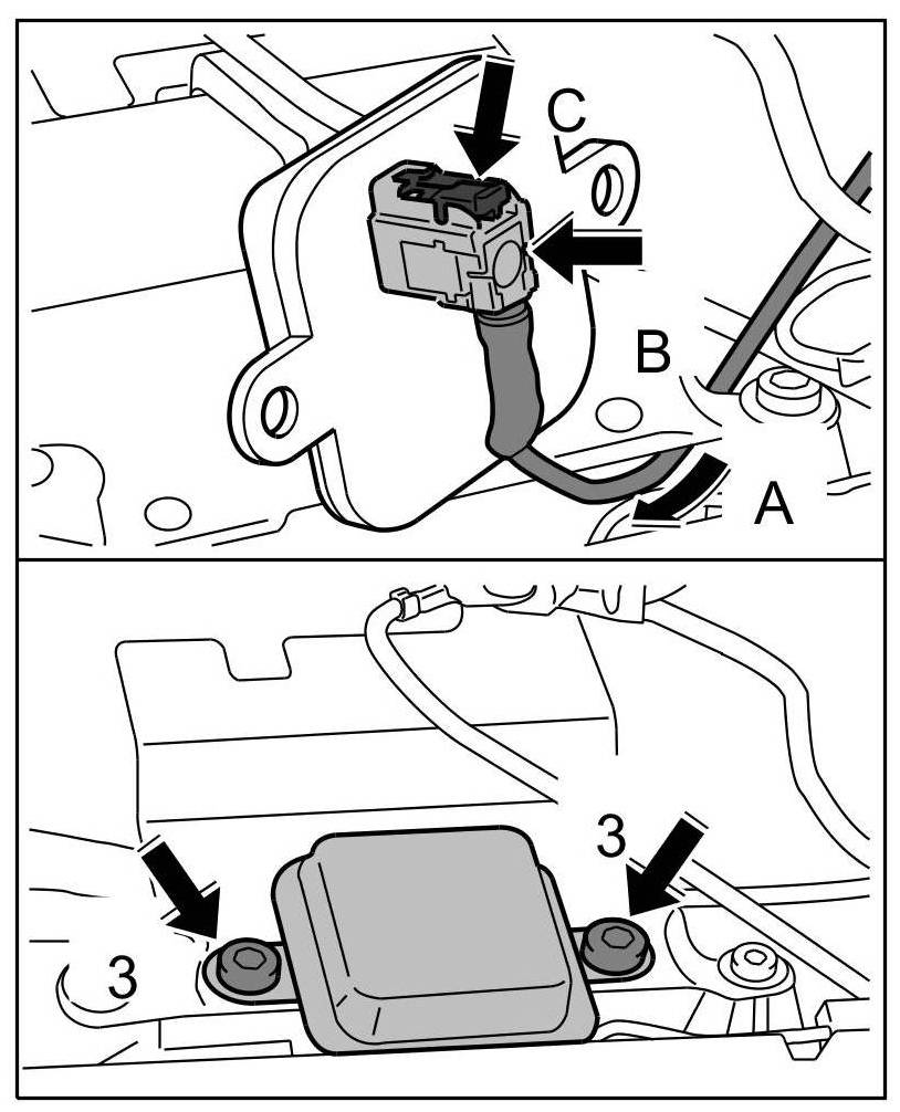 17. Push both connectors onto right antenna amplifier -arrows B- until locking tabs -arrow C- are felt to engage.