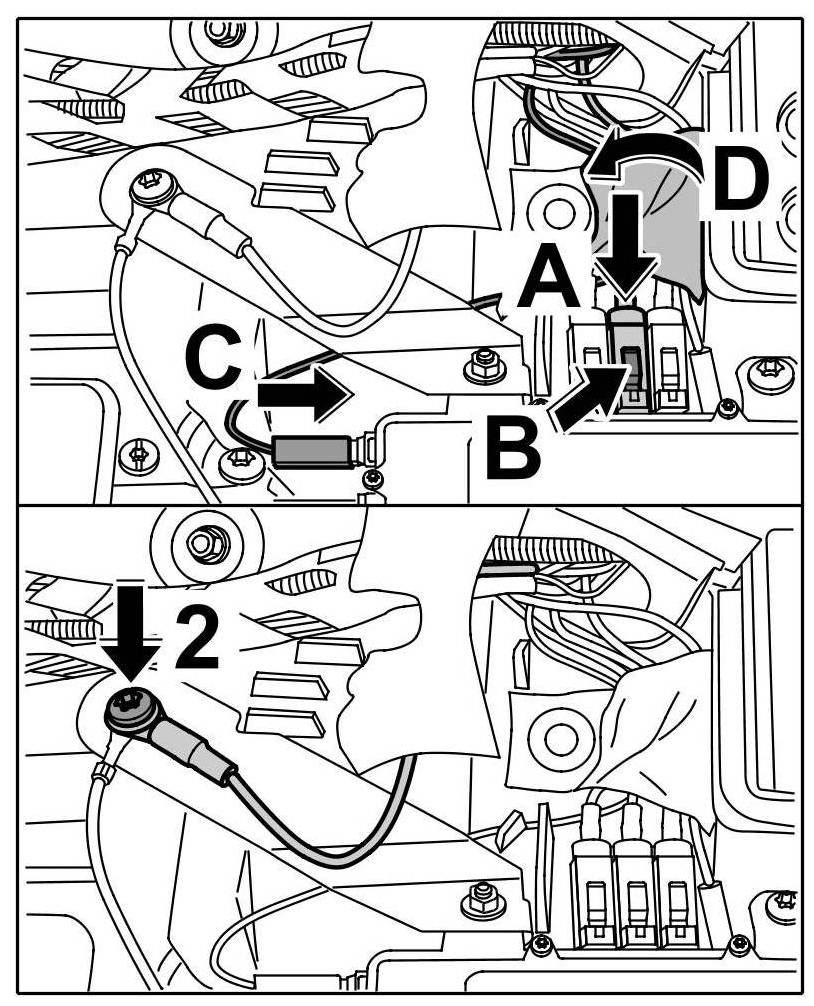 12. Press plug connections into support -arrows C- until locking tabs are felt to engage -arrows D-.