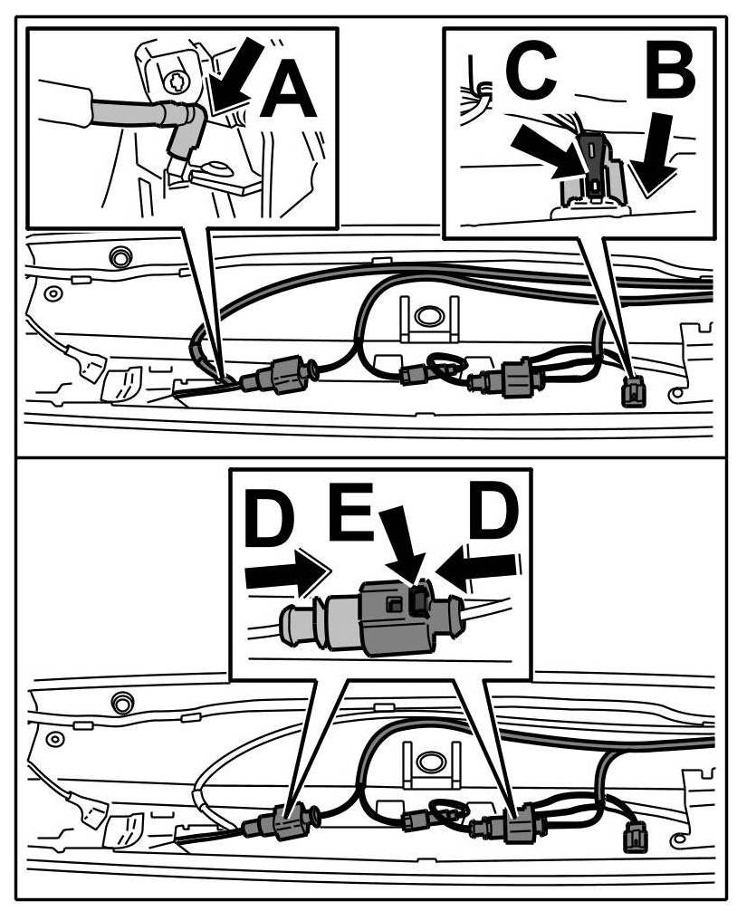 9. Push connector onto lock lower part for rear window -Arrow C- until locking tabs -Arrows B- are felt to engage.