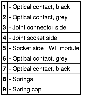 The LWL is delivered with affixed plastic contacts. These contacts are latched in the connector housing in the case of repairs. Grey and black contacts with identical mechanical dimensions are used.