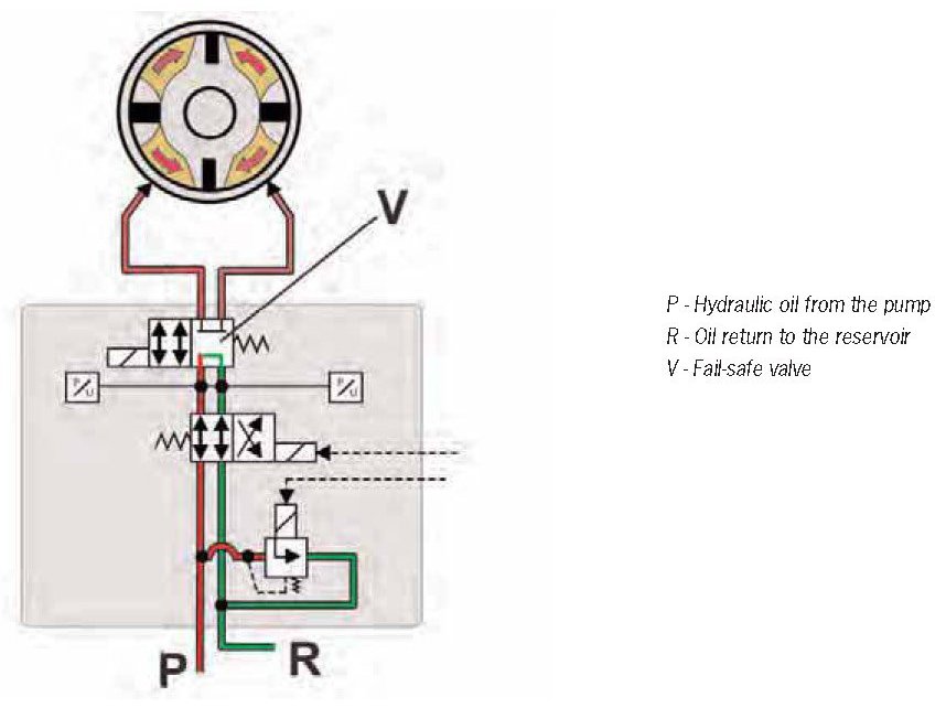 The entire system is switched to fail-safe mode to ensure safe driving. The fail-safe valve in the front-axle valve block is de-energized, which causes the pump hydraulic system to short circuit. The hydraulic oil from the pump flows directly back into the reservoir. At the same time, the connections for the swivel motor are closed so that the pressure in the swivel motor is maintained. The anti-roll bar remains in this position and continues to work in the conventional way.