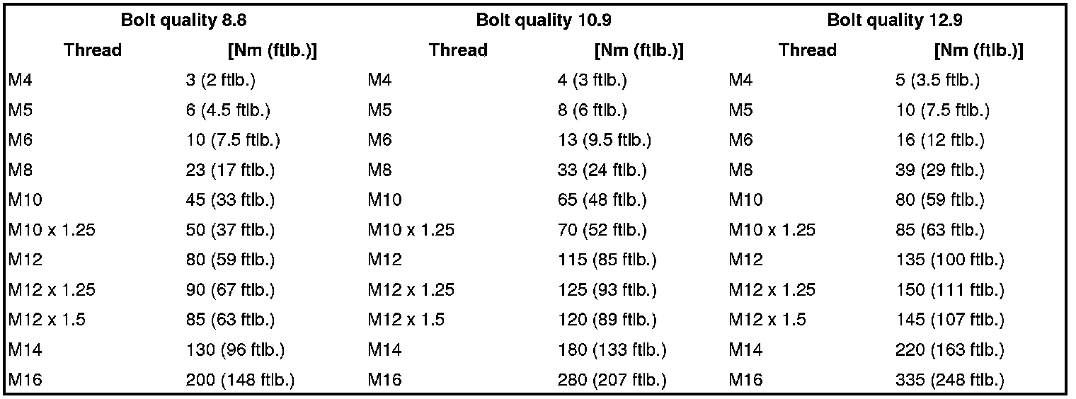 The torques in the table below generally apply to screws that are not specifically listed =>