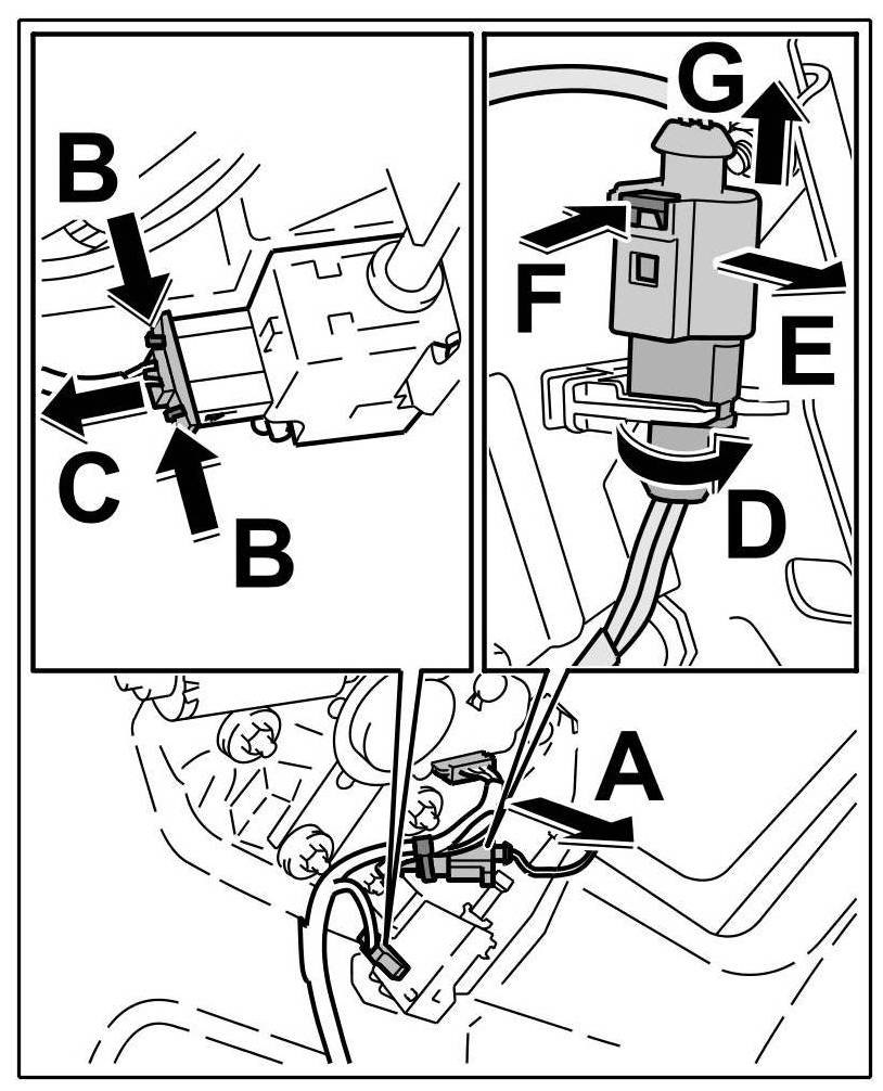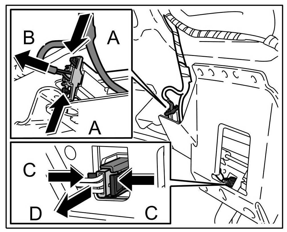 2. Release connector on contact switch -Arrows C- and remove it -Arrow D-.