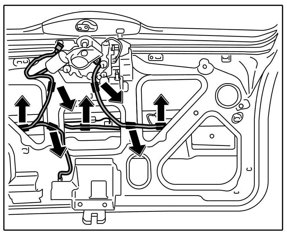 6. Unclip wiring harness on window frame -Arrows B- and remove it.