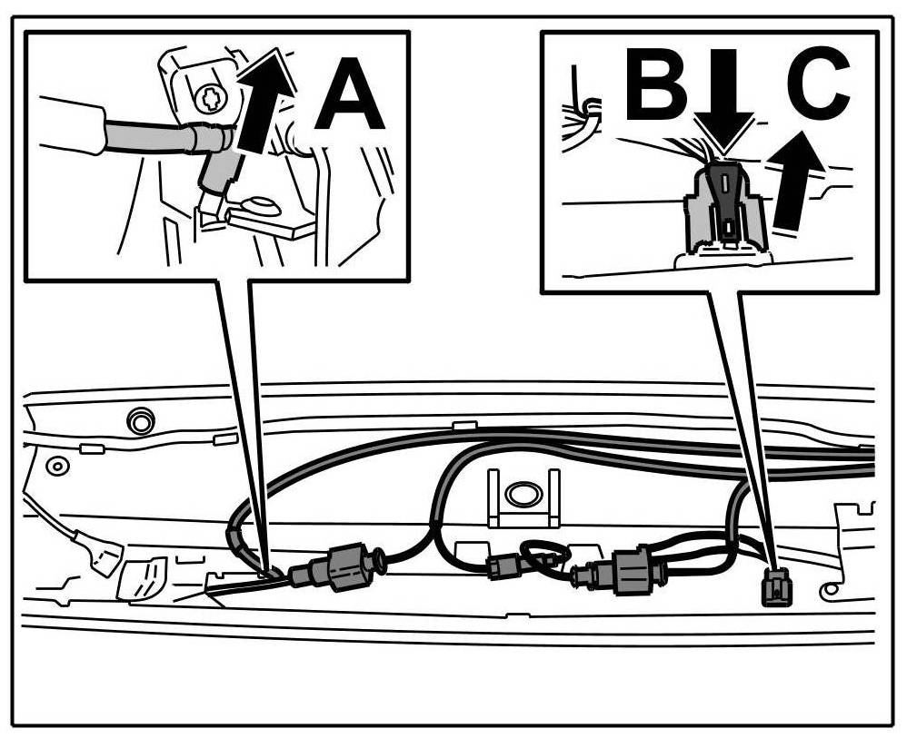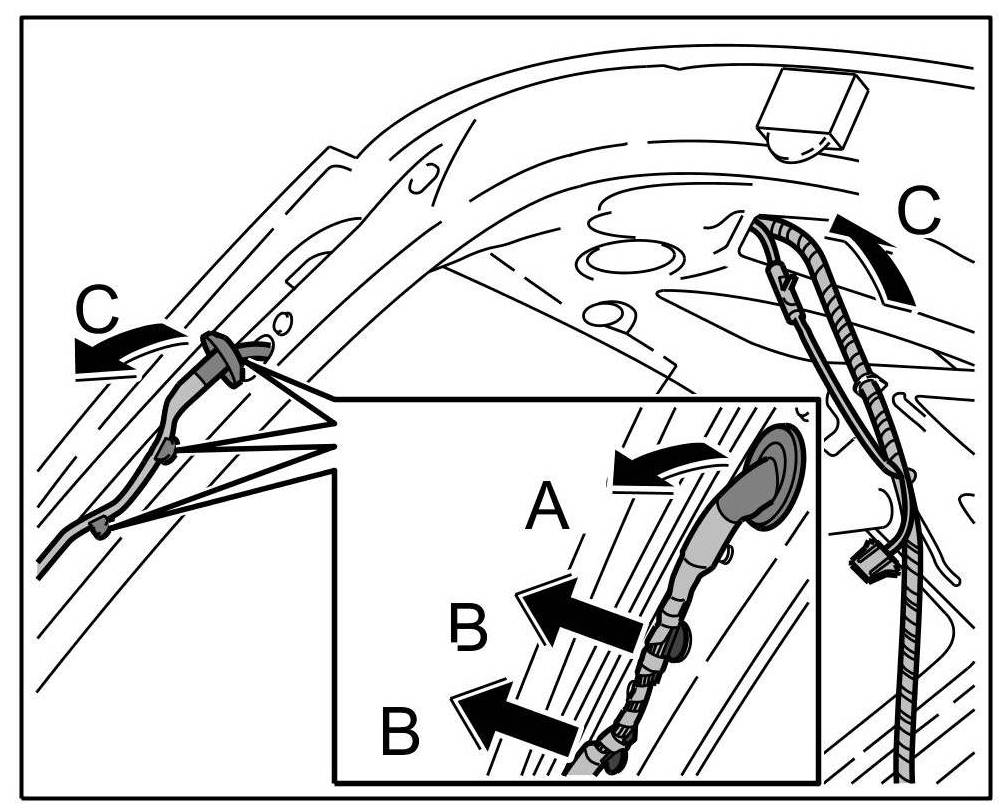 8. Pull wiring harness inside -Arrows B-. As space is limited, push the connectors individually past the rear lid hinge.