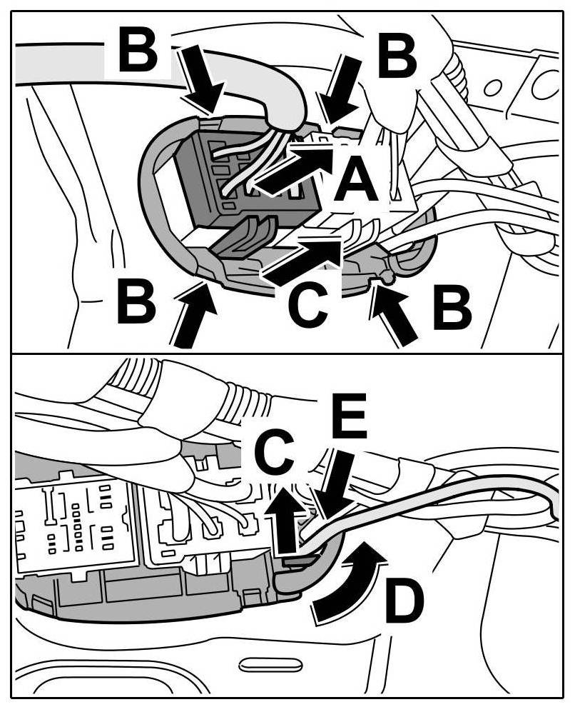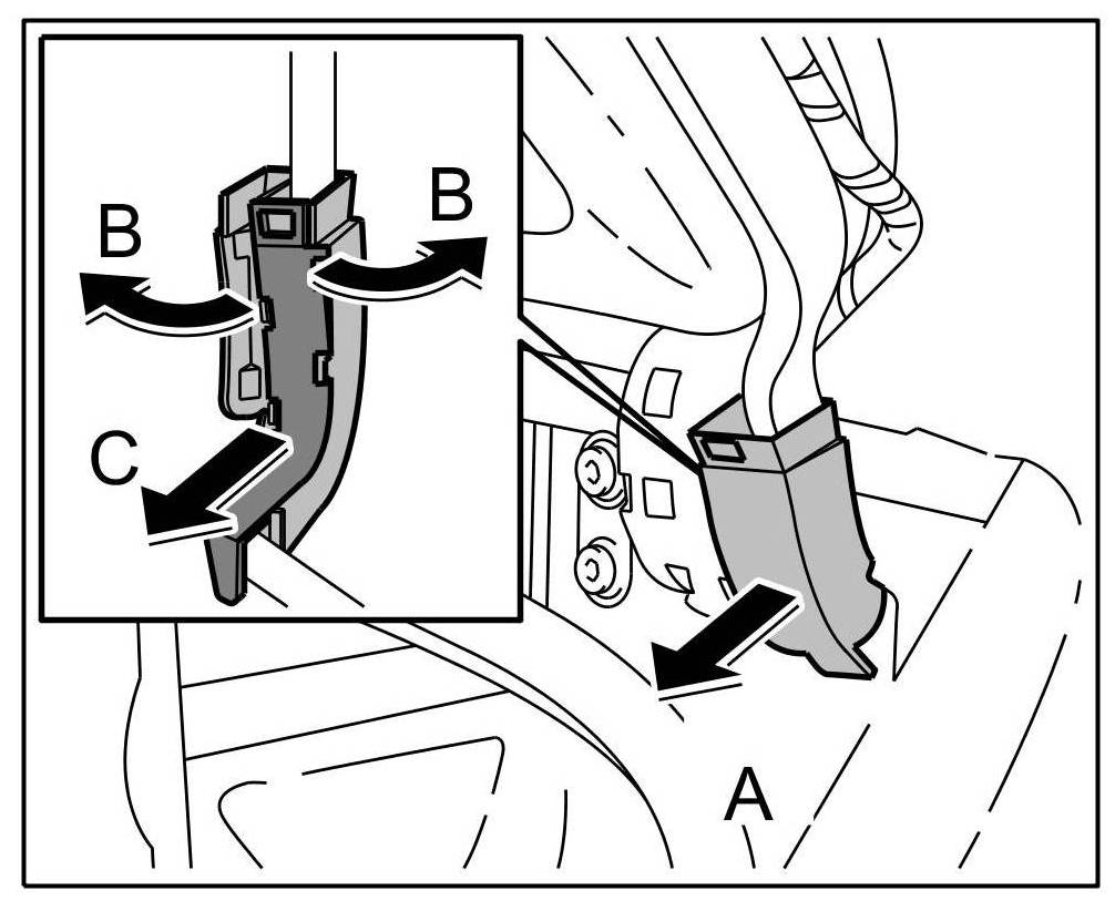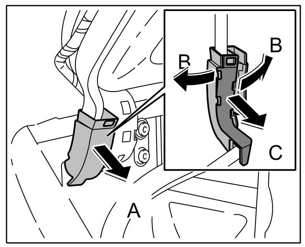 8. Open wiring duct -Arrows B- , remove cover -Arrow C- and take out wiring harness.