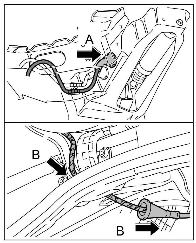 5. Press out the front rubber sleeve -Arrow A- and remove the line -Arrow B-.