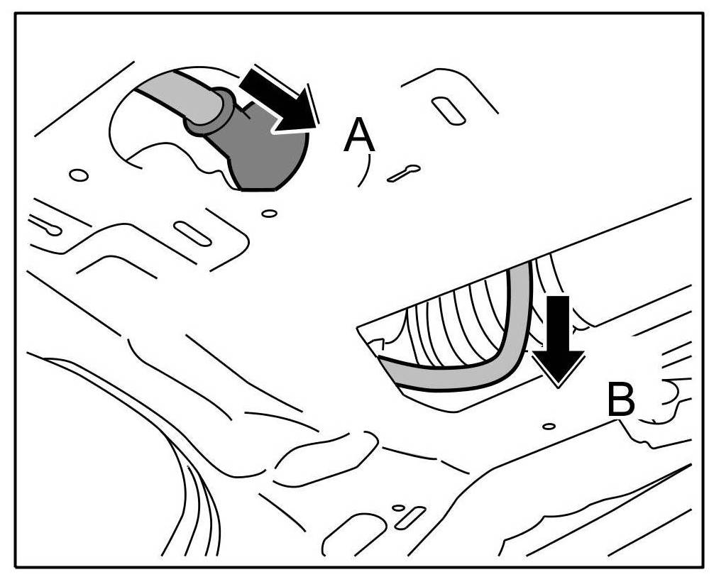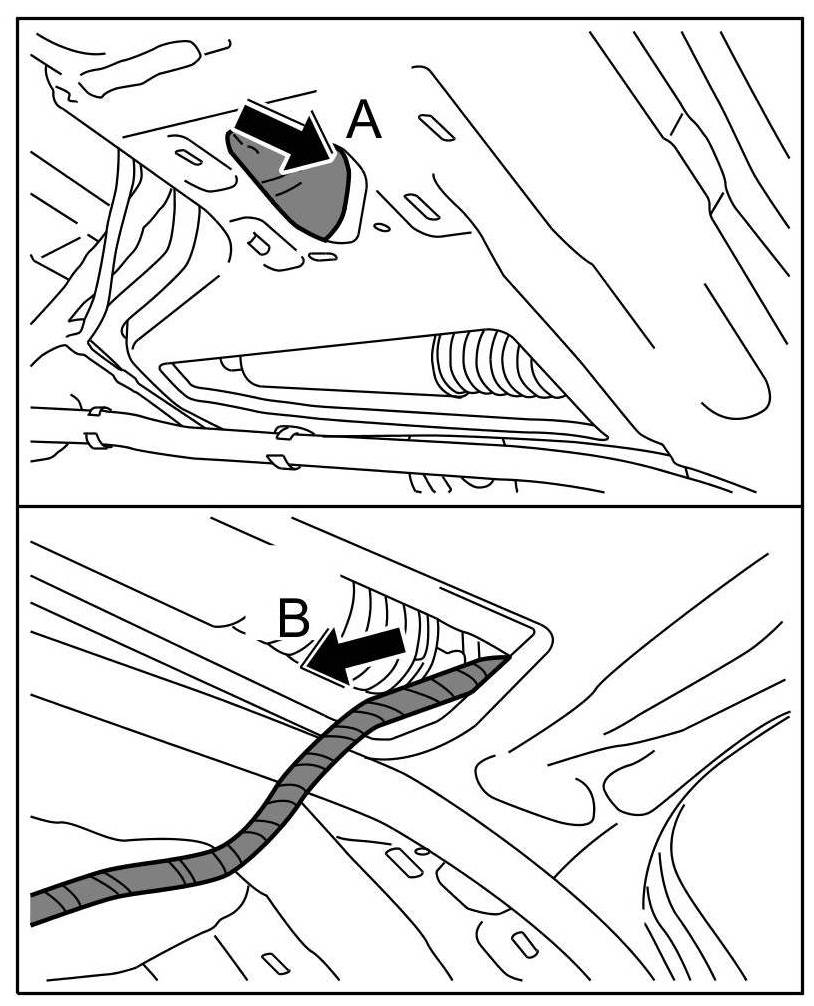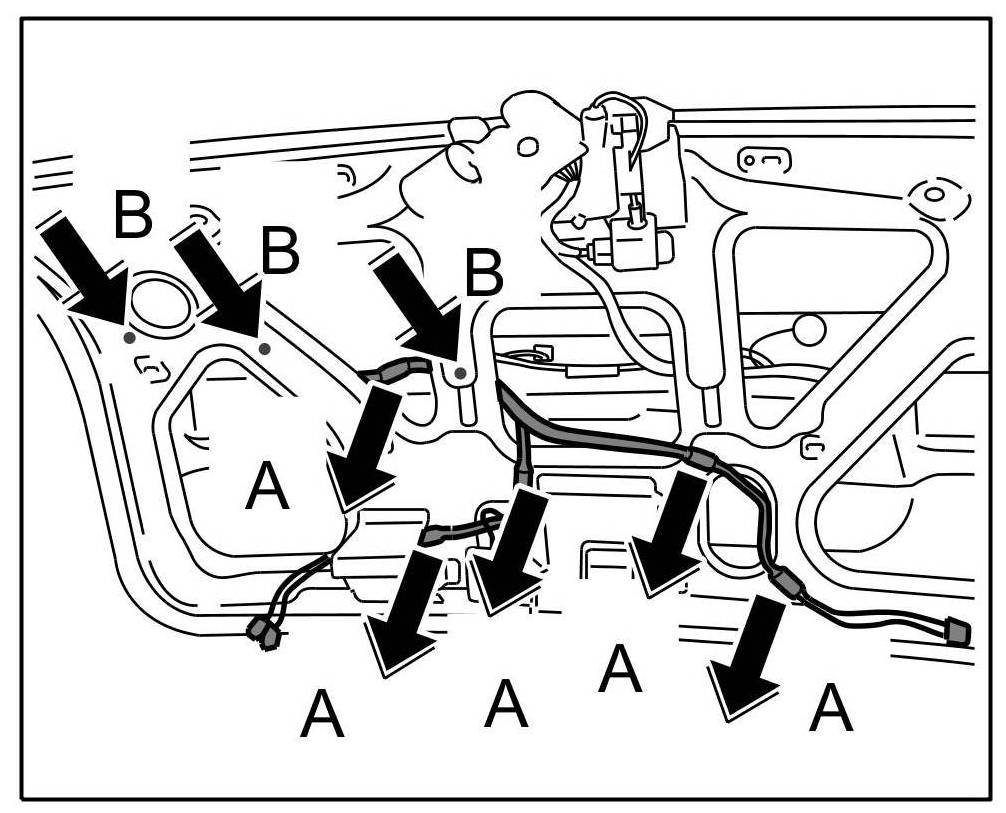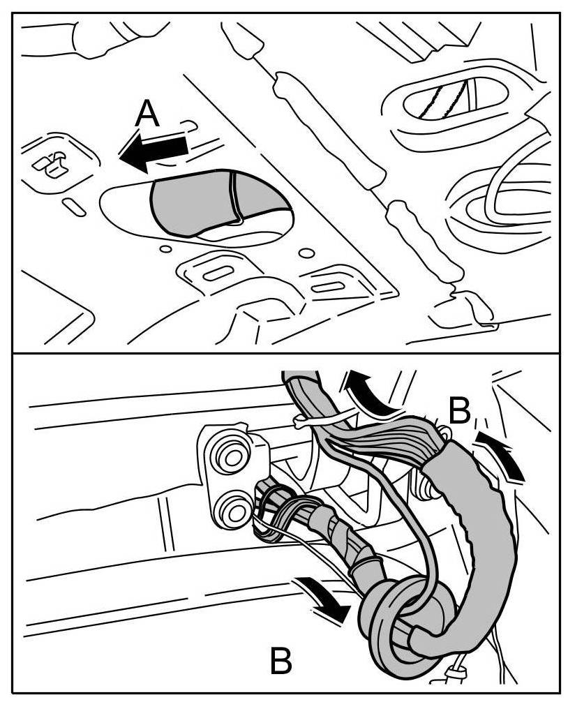 12. Pull out wire harness on hinge to the rear -arrows B-.