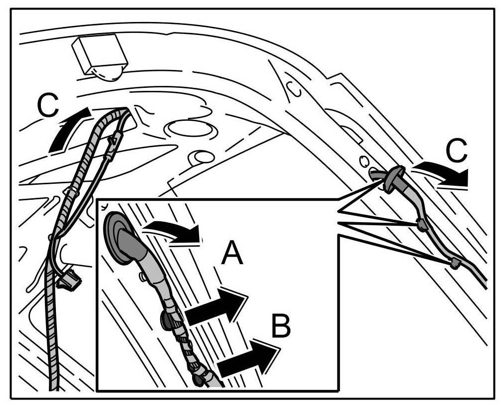 8. Unclip wiring harness on window frame -Arrows B- and remove it -Arrows C-.