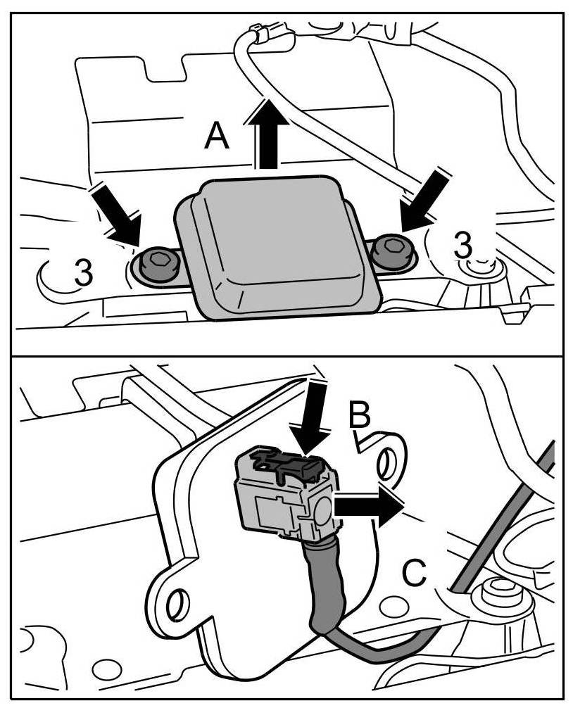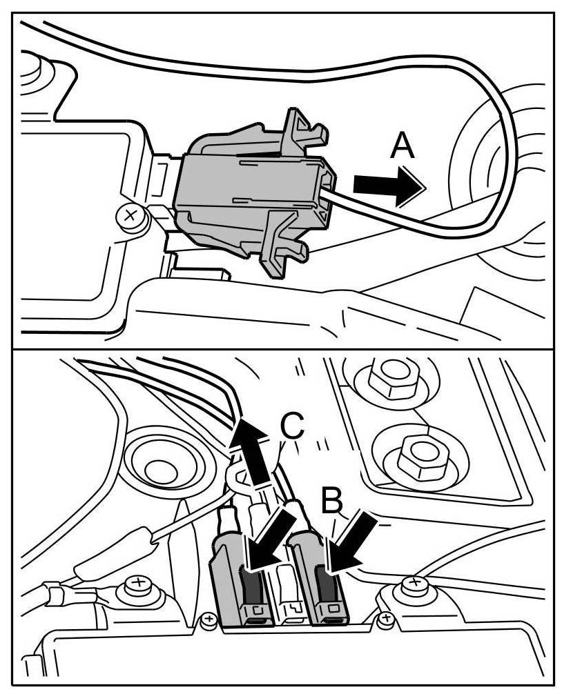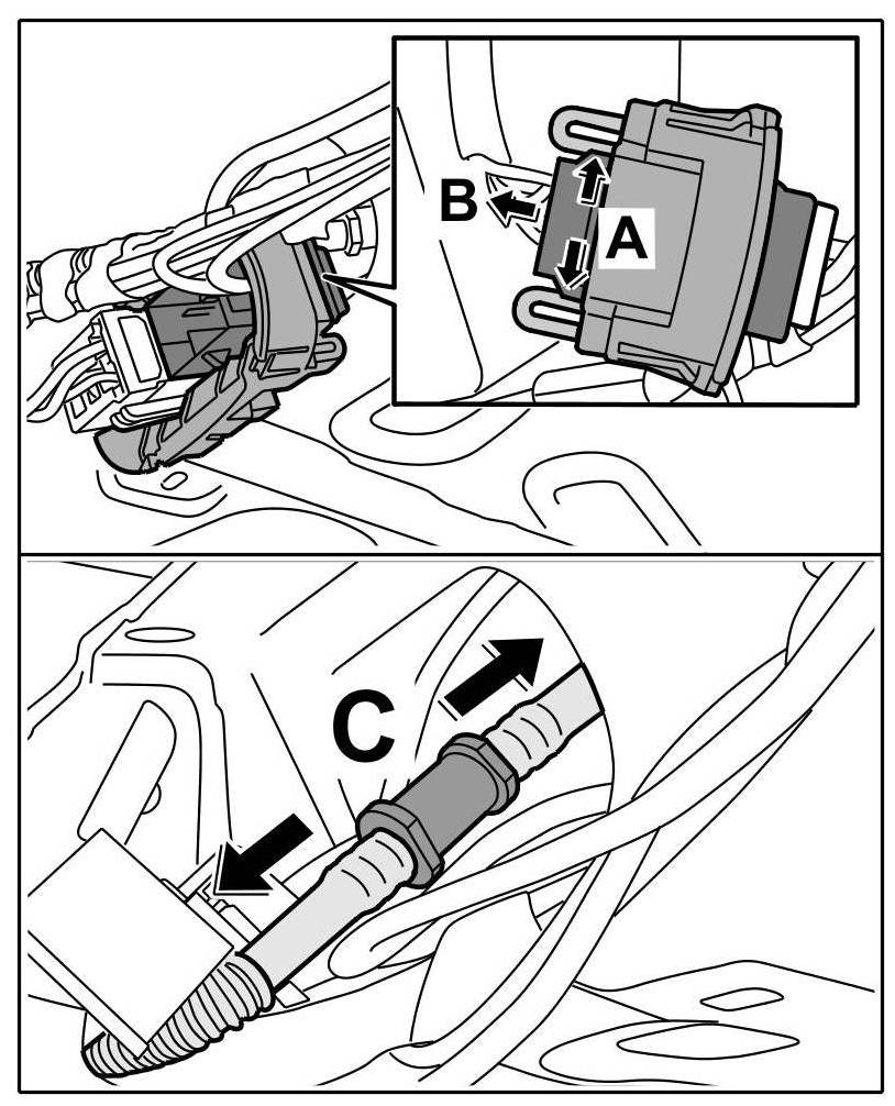 11. Release connector -arrow B- and disconnect it from the GPS sensor -arrow C-.