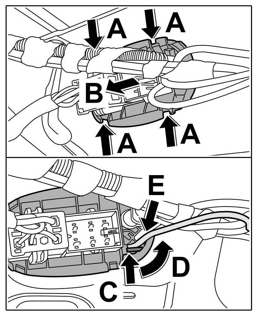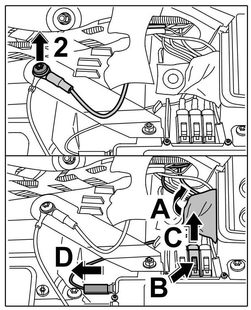 4. Release support for socket -arrow C- , open it -arrow D- and remove ground strap -arrow E-.