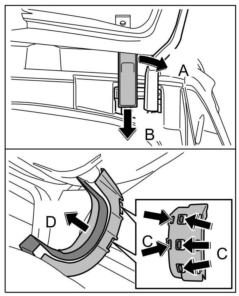 9. Release cover -arrows C- , take it off the wiring duct -arrow D- and remove wiring duct from wire harness.