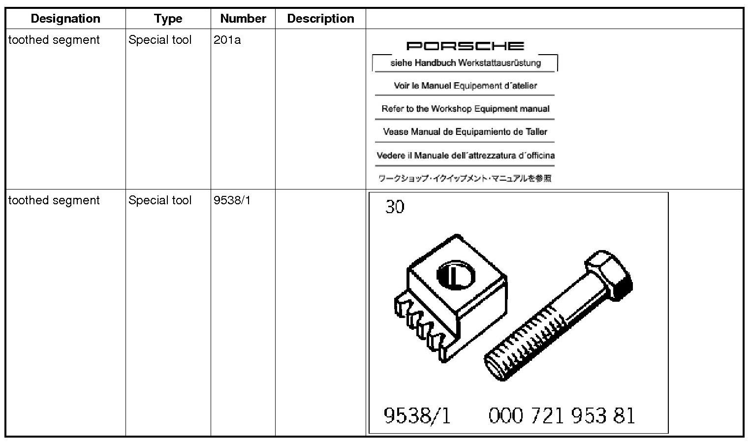 1. Block flywheel. To do this, attach a suitable toothed segment toothed segment 201a or toothed segment 9538/1 to a screw hole in the crankcase so that at least one tooth engages with the starter teeth. Place a washer (approx. 5 mm) under the segment if necessary. => Toothed segment