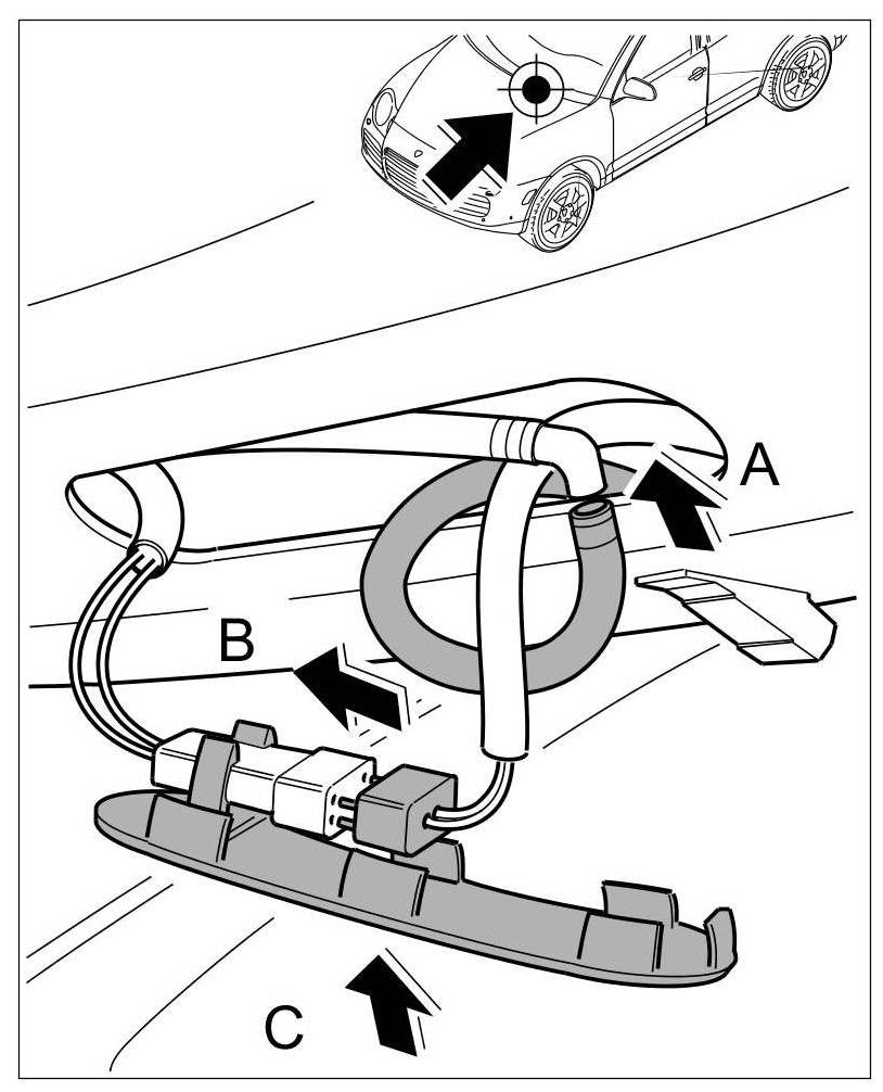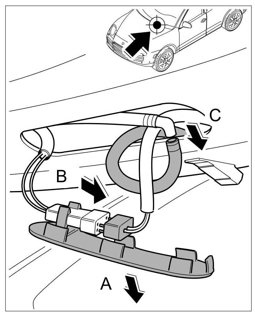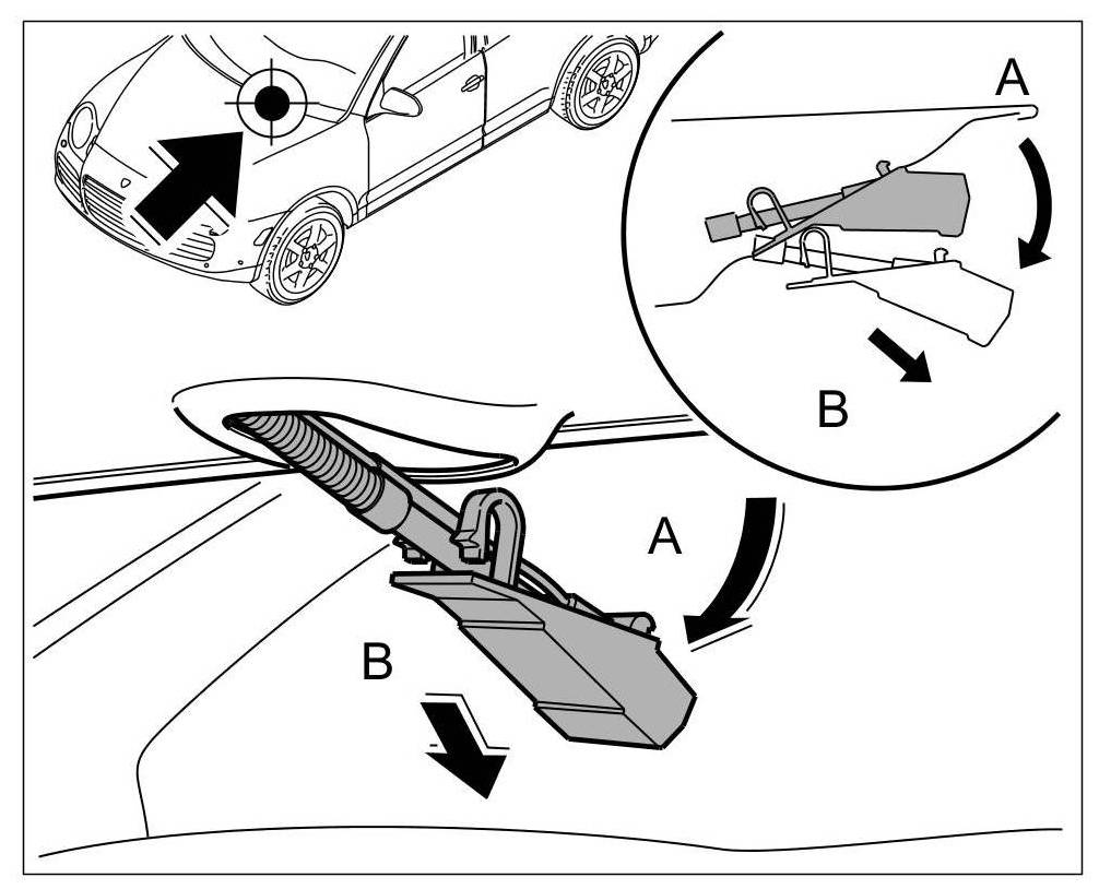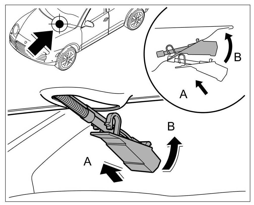 1. Insert spray nozzle along with the lines under the bonnet -arrow A- and engage -arrow B-.
