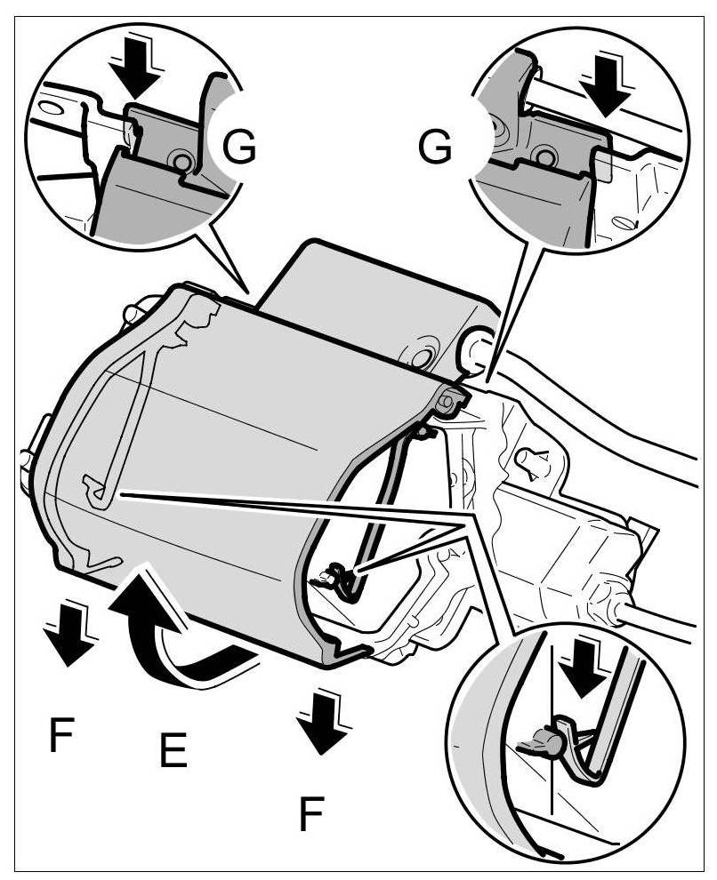 1.2. Insert trim on housing -Arrows G- from above and slide it into position by pressing downwards -Arrows F-. As shown in the cross section, the cover must be hooked securely onto the camera and must not rattle.