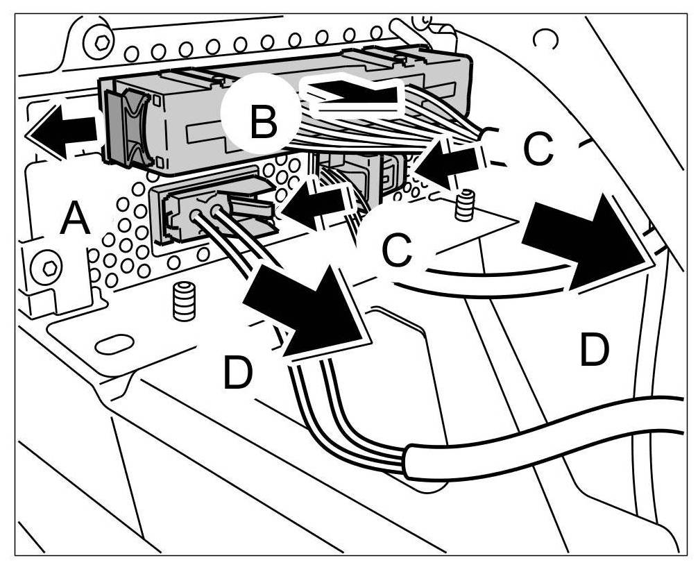 2. Release -arrow C- and remove -arrow D- connector for optical waveguide.