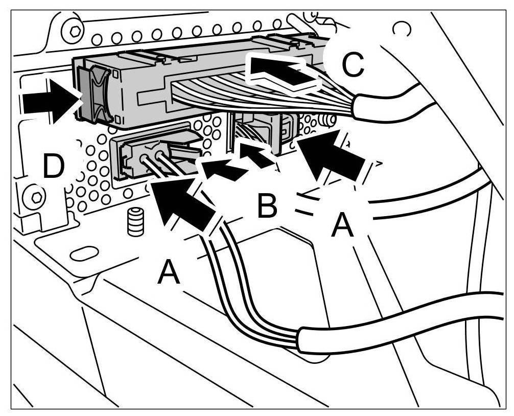 3. Press connector into the loudspeaker amplifier -arrow C- and press in the locking element -arrow D- until it engages securely.