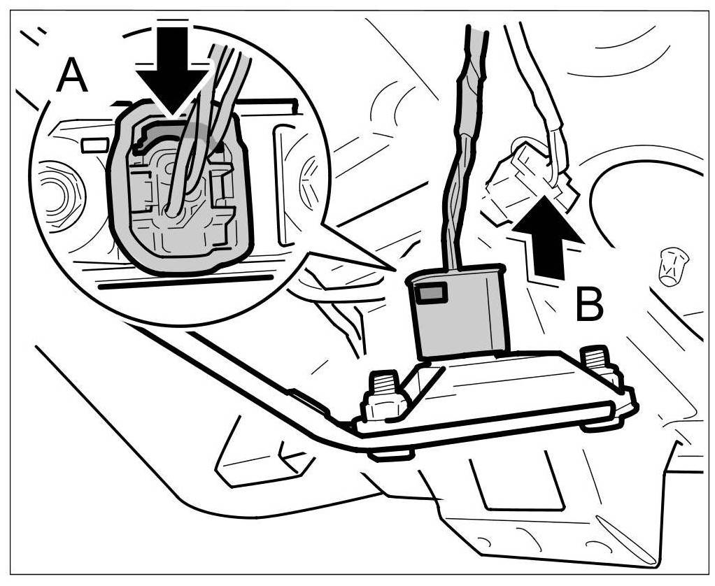 2. Release connector -arrow A- and pull it off the rear-lid tilt sensor -arrow B-.