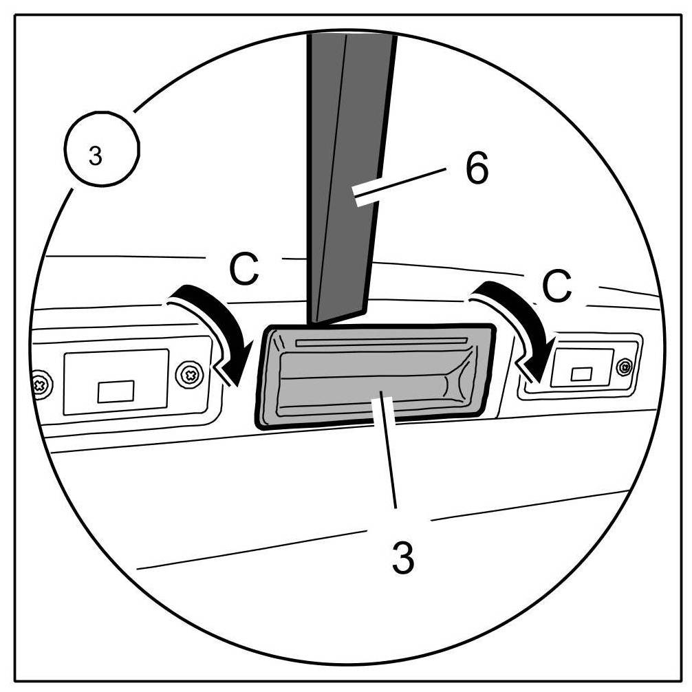 3. Carefully prise out the lid release -3- with a plastic wedge -6- at the rear edge of the housing -Arrows C-.