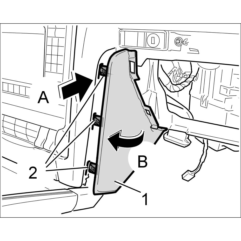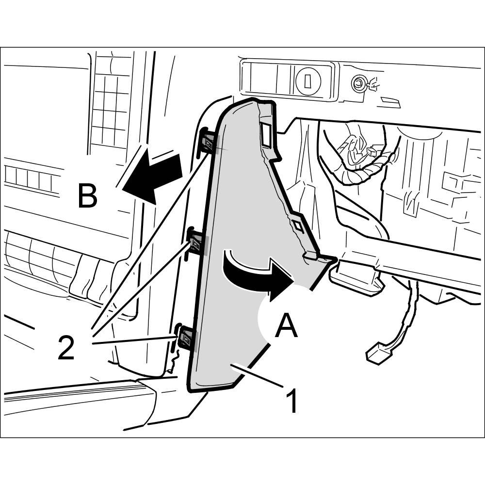 1. Unclip cover for bracket -1- using a plastic wedge at the retaining clips -2- and swivel it out -arrow A-.