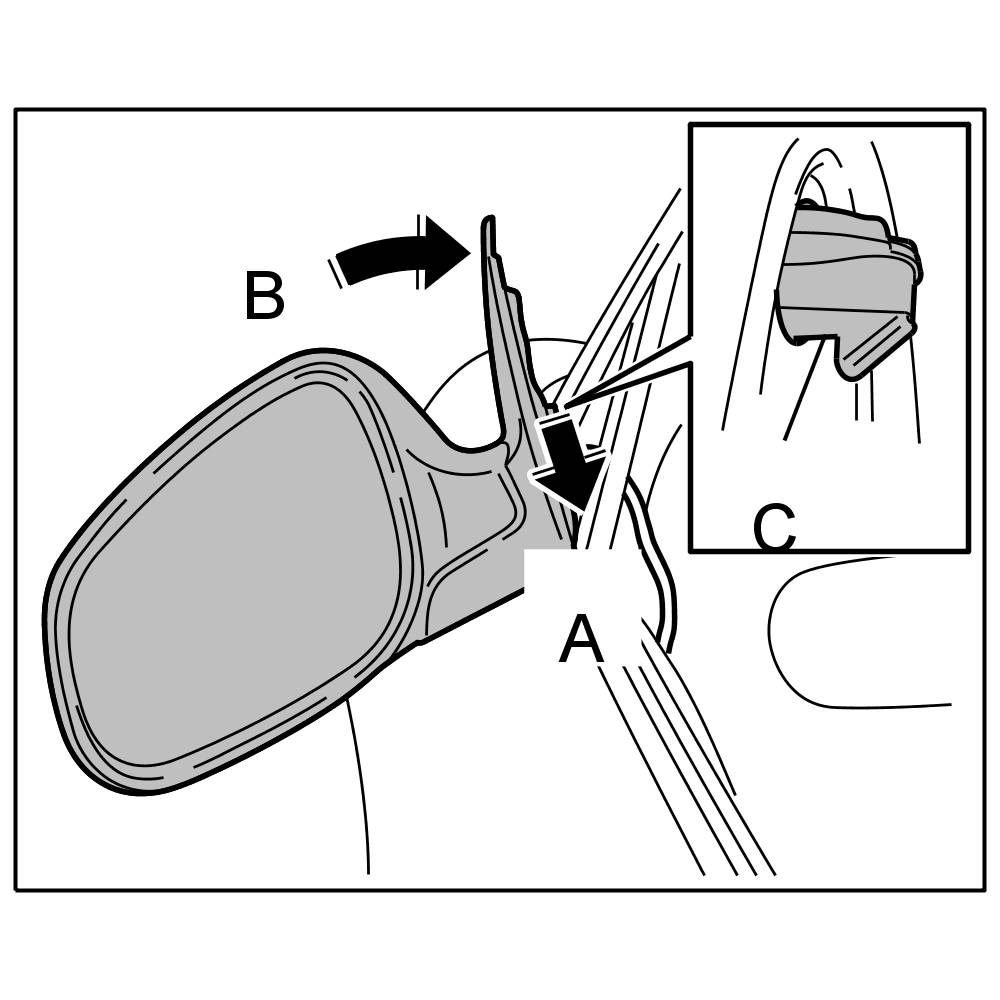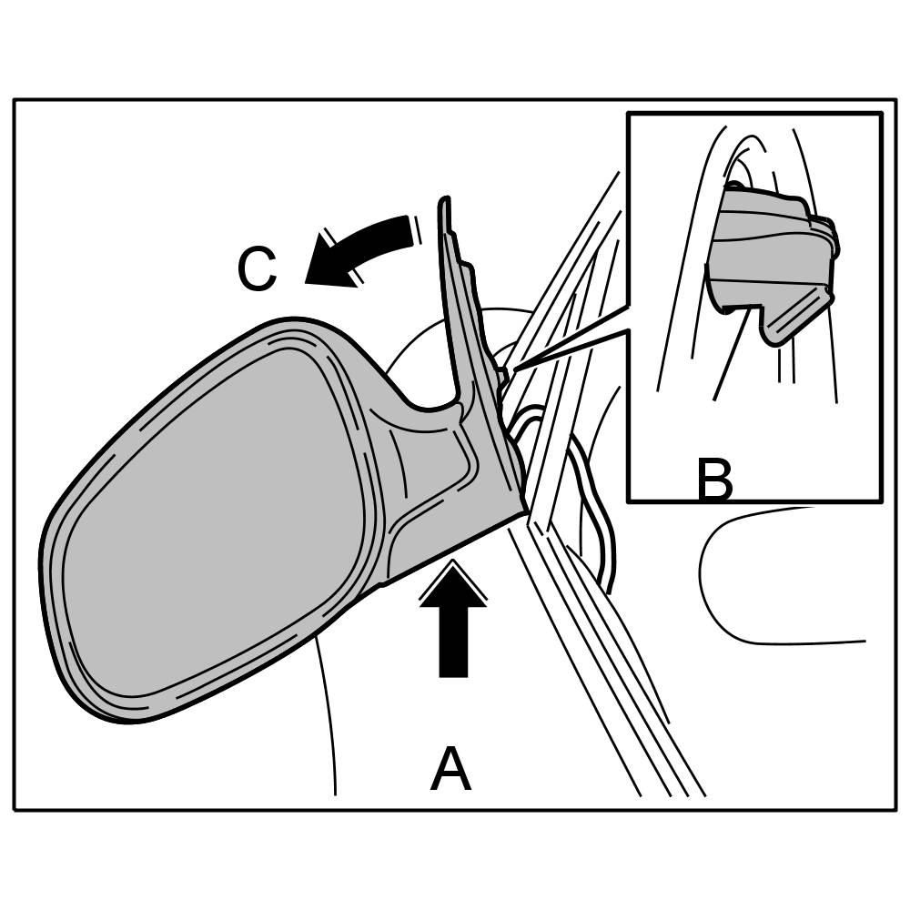 2. Press mirror downward until the retaining pivot -C- engages in the window frame.