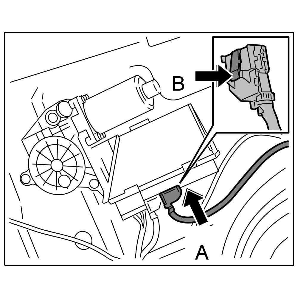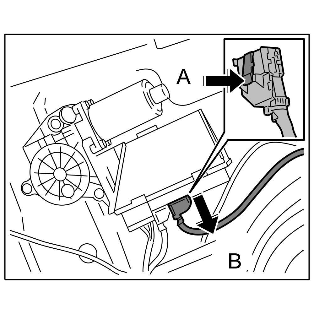 5. Fit connector to power window motor -Arrow A- and press in until the locking tab -Arrow B- is felt to engage.