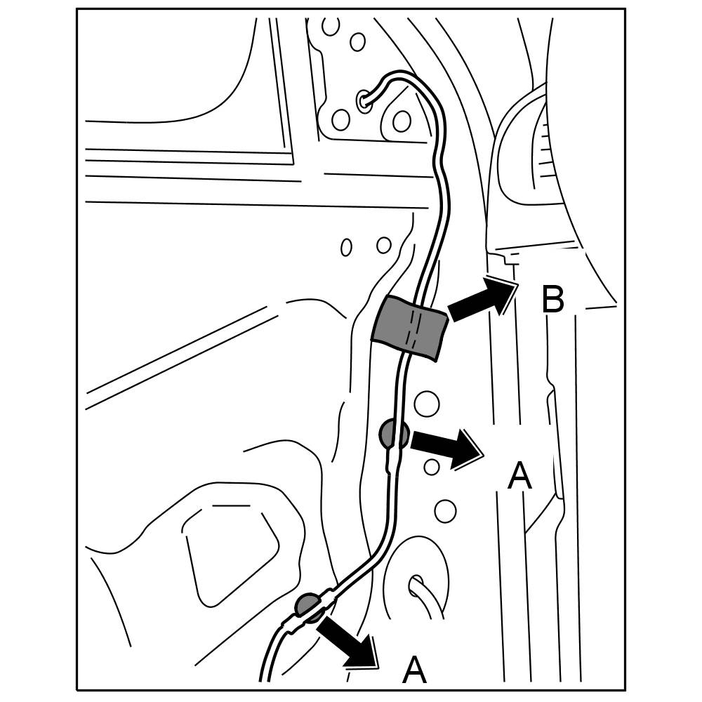 4. Clip wiring harness onto door inner panel -Arrow A- and fasten with adhesive felt -Arrow B-.