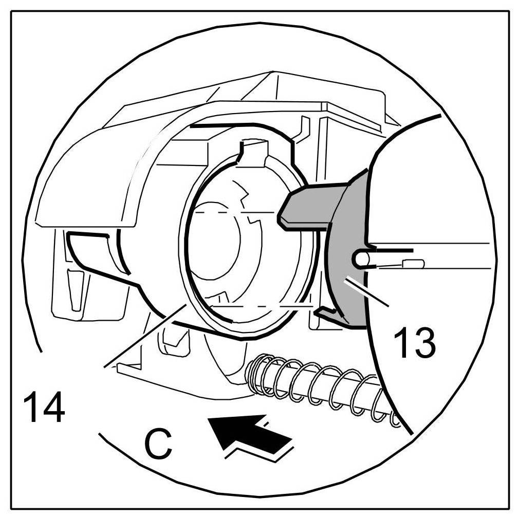 4.1. Insert cover of lock for rear backrest -7- -Arrow C-. The release lever guides -13- must engage perfectly in the supports of the locking mechanism -14-.