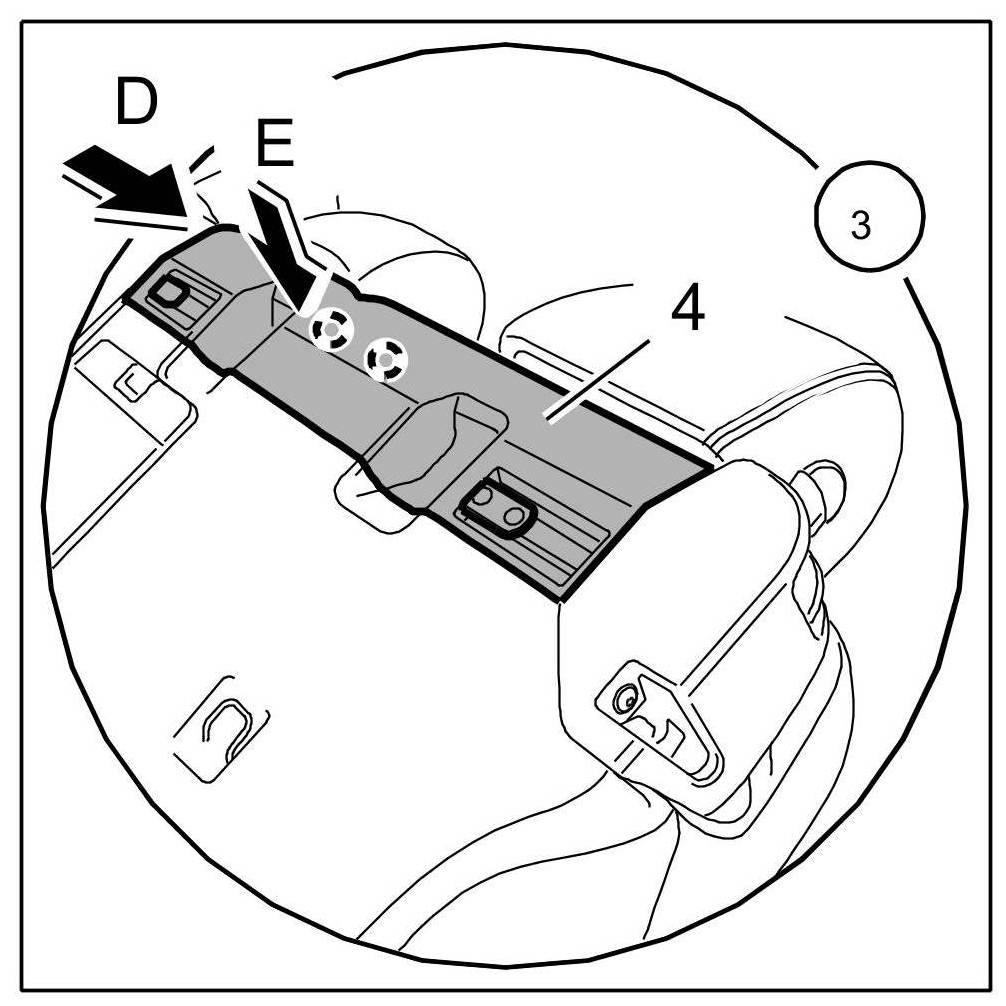 6. Insert cover for rear backrest -4- -Arrow D- and clip in at the fastening clips -Arrow E-.