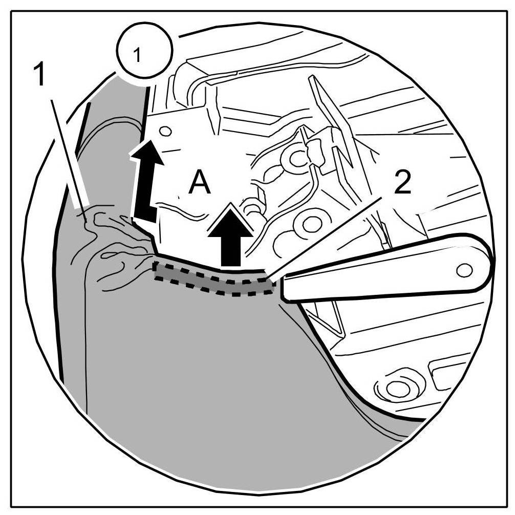 2. Lever out seal -2- on cover for rear seat -1- by inserting a plastic wedge into the front right corner -Arrow A-.