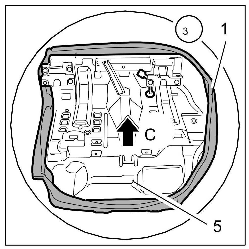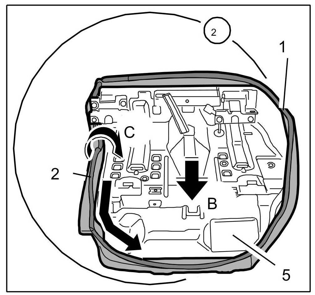 4. Press piping -2- of cover for rear seat -1- completely into the seat frame in direction of arrow -Arrow C-.