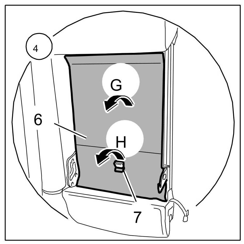 8.1. Remove cover of load-through provision: Fold over cover for backrest -6- -Arrow G- and pull out over the holding strap -7- -Arrow H-.