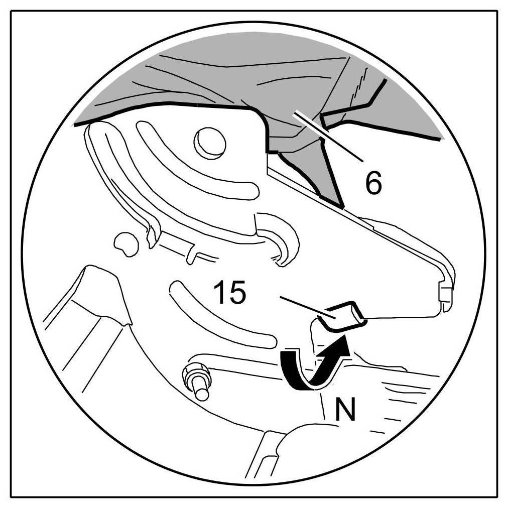 13. Detach hook -15- of covering for backrest -6- -Arrow N-.
