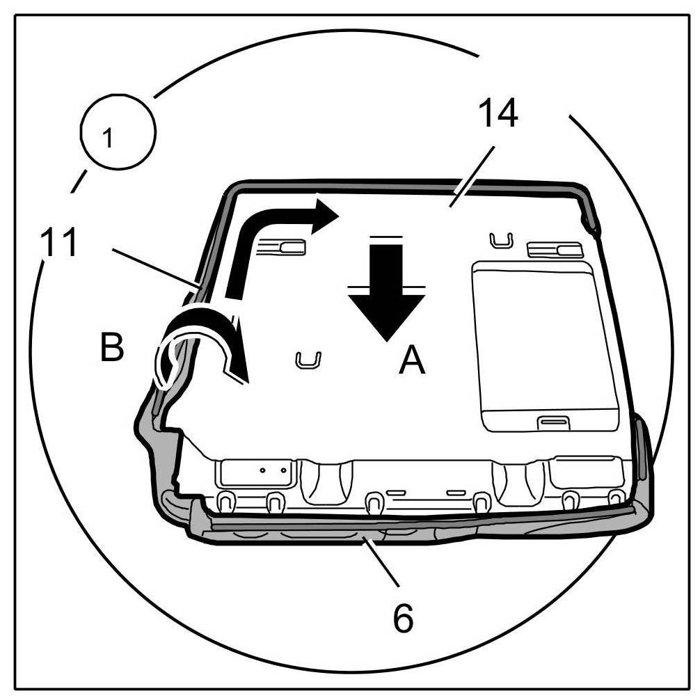 4. Press piping -11- of cover for backrest -6- completely into the backrest frame in direction of arrow -14- -Arrow B-.