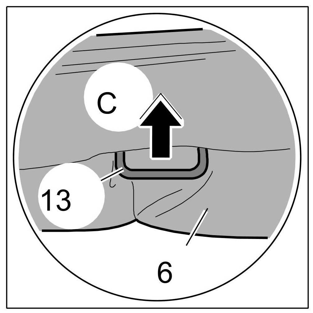 2. Install padding: Place backrest frame -14- on the padding with cover for backrest -6- and align -Arrow A-. In doing so, pull cover for backrest -6- over the holder for child-lock button -13- -Arrow C-.