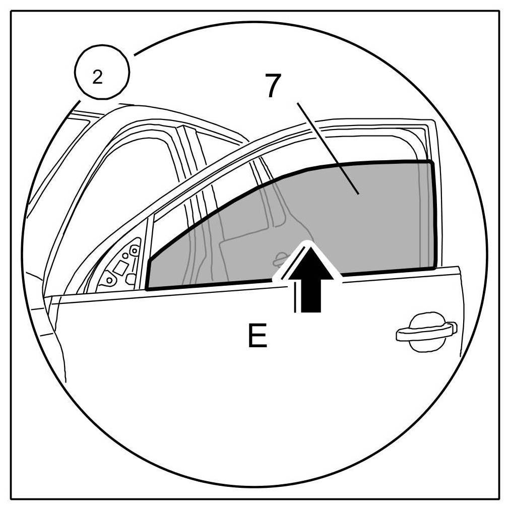 2.1. Close the front door window -7- fully ( -Arrow E- ).