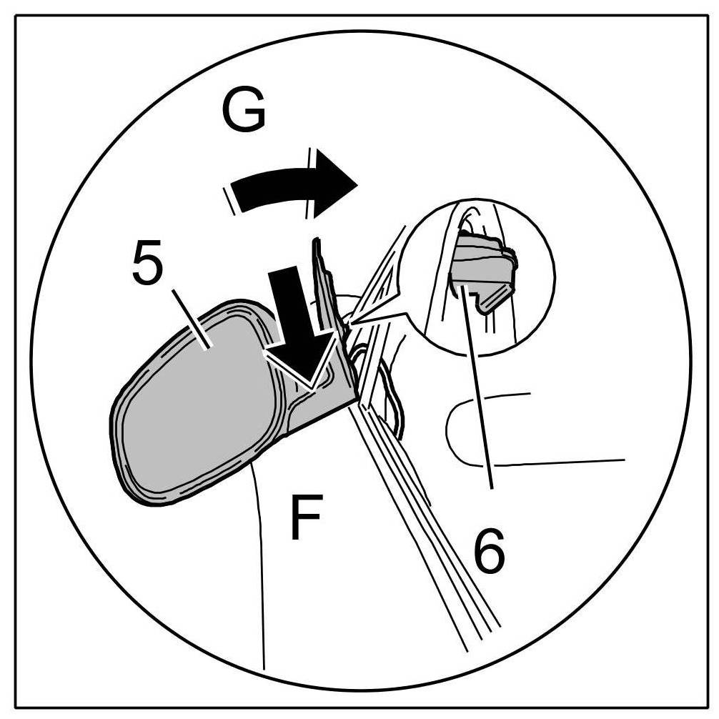 3.1. Attach mirror -5- to window channel ( -arrow F- ) and fold upward and inward ( -arrow G- ).
