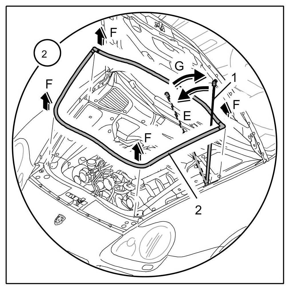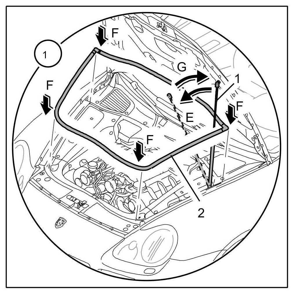 1.1. Unclip pneumatic spring -1- at the lid end and pivot to the side -E- => 553119 Removing and installing front pneumatic spring - section on "Removing".