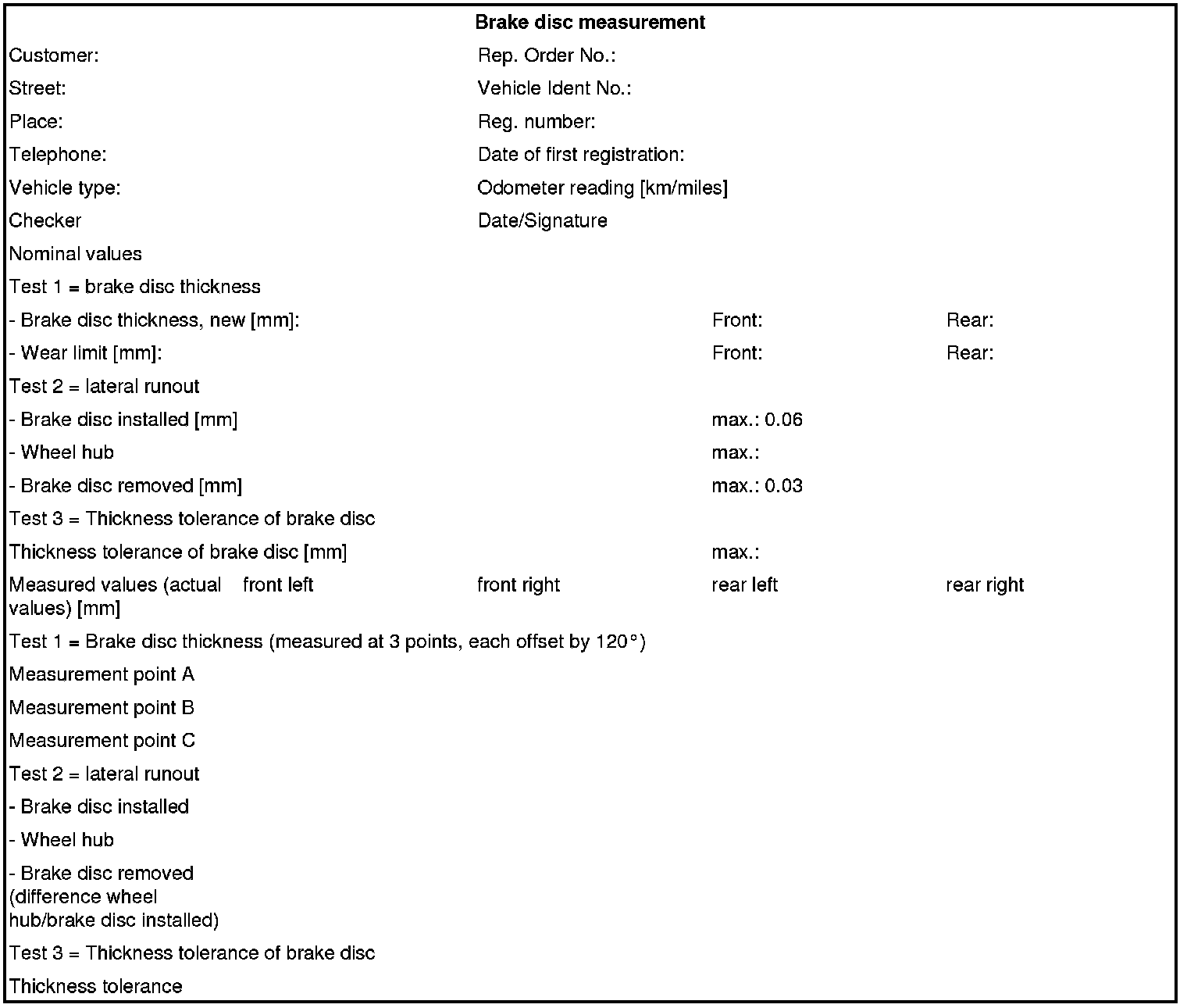 2. Before measurement (Test 1 through Test 3), enter the general data, vehicle type and the missing nominal values (new brake disc thickness / brake disc wear limit) into the data card.