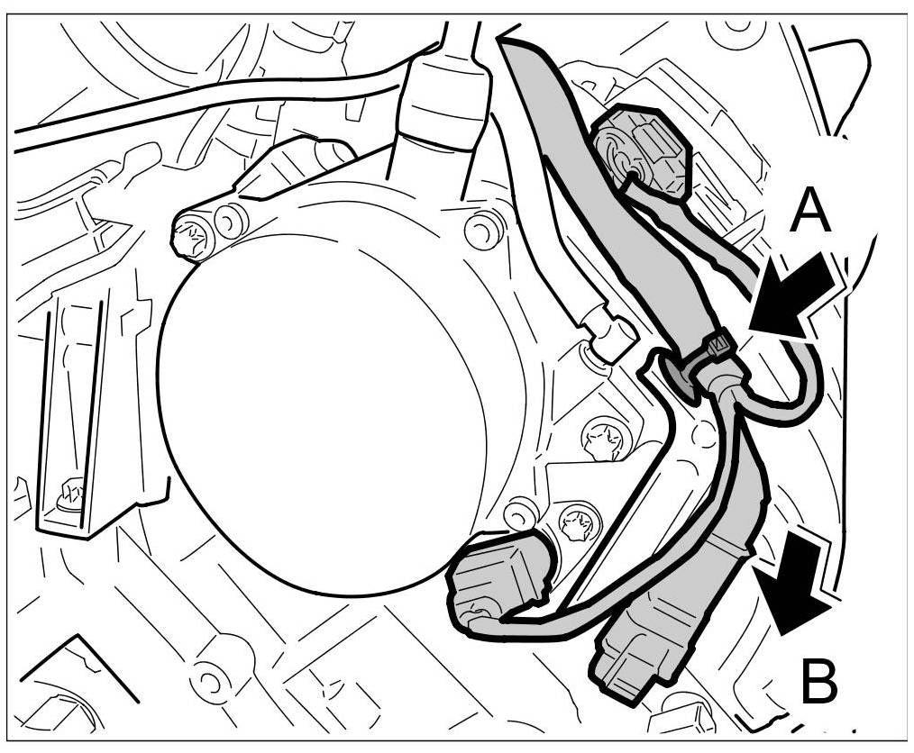 8.2. Slide engine wire harness onto the holder -arrow B-.