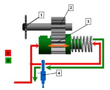 Depending on the input values for engine speed, engine load, engine oil temperature and the expected change in engine speed, a specific control valve position ( -4- ) is defined using a map in the DME control unit. The control valve position regulates the oil pressure for the spring piston on the gear wheel, which can move in axial direction. The oil pressure on the control piston is not regulated on the other side. The control valve is open fully in the non-energised state and as a result, the oil pressure is the same on both sides, which means that the gear wheel will not move. In other words: the pressure difference between the spring piston and the control piston can be used to control every position. When the gear wheel moves, the teeth are still only partially engaged and as a result, performance and friction as well as energy requirements are reduced.