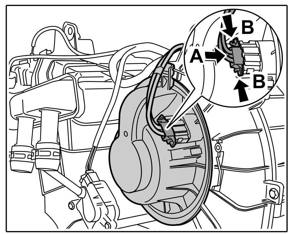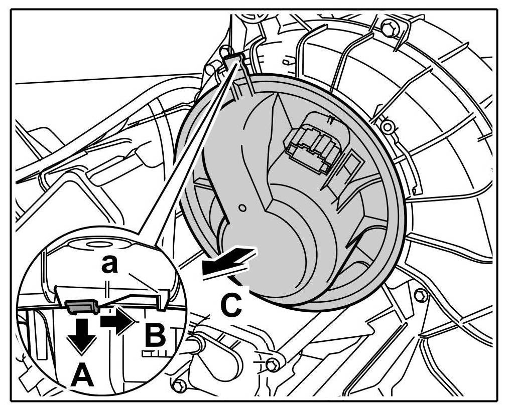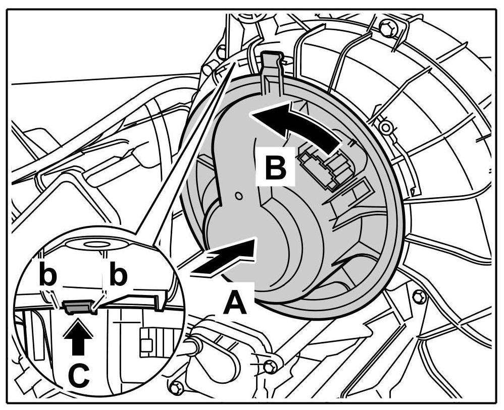 1. Insert the blower motor -arrow A- and twist to the left -arrow B- , until the locking hook can be felt to engage in the twist lock -b- -arrow C-.