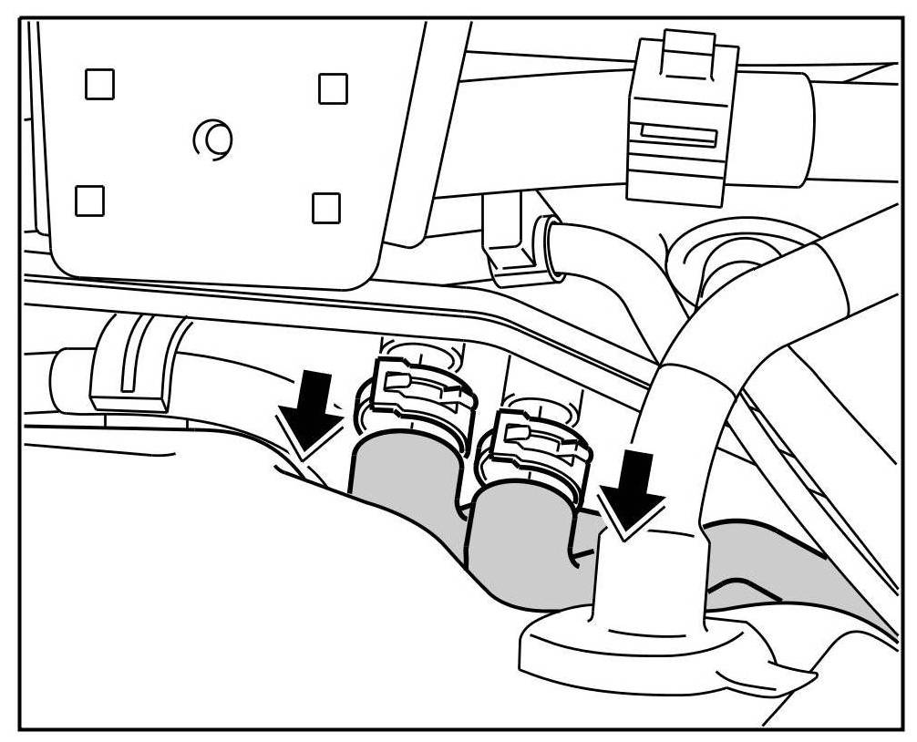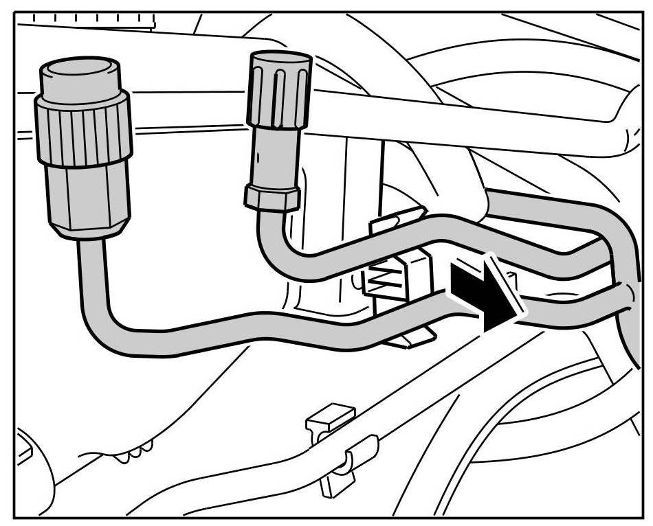 10. Lift the vehicle. Hold both refrigerant lines together, twist them, and pull them downward through the left wheel housing opening.