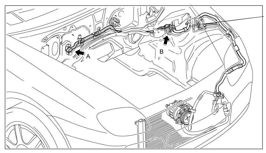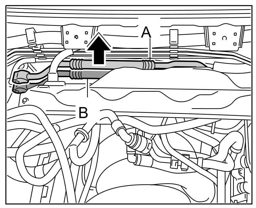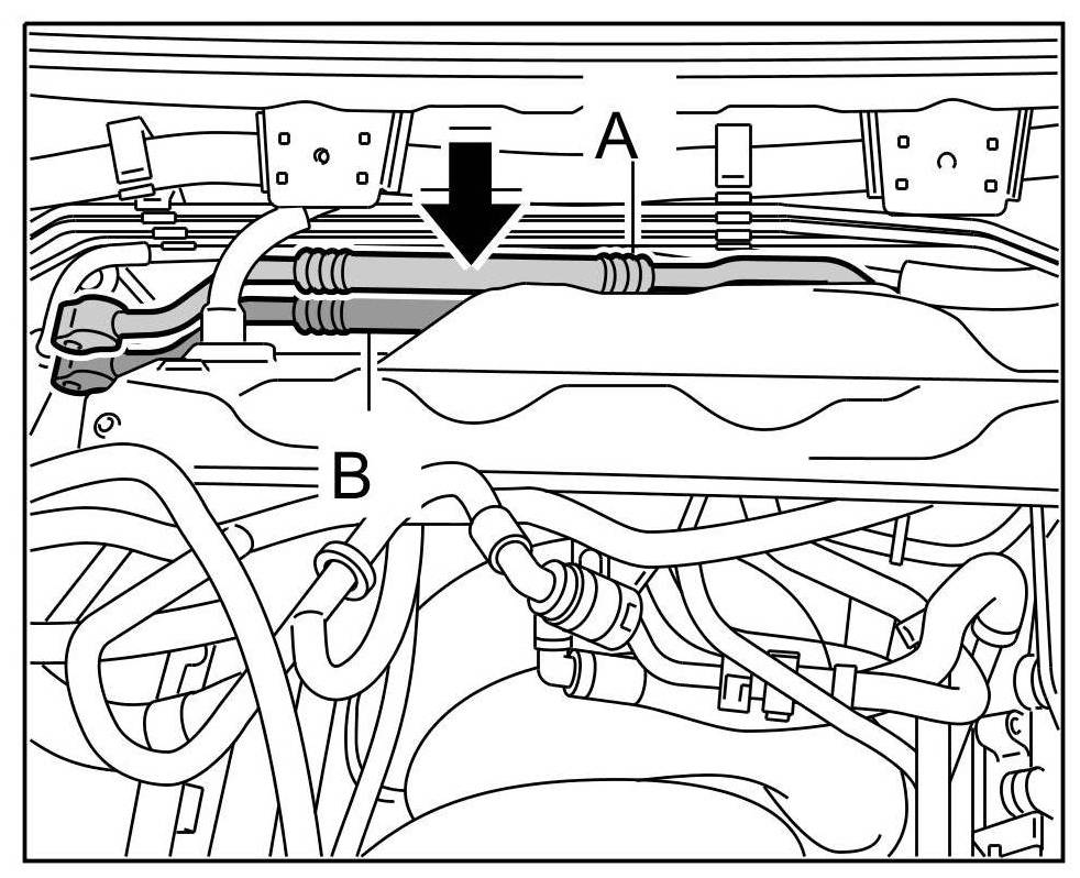 9. Loosen refrigerant lines -A and B- from the retaining clips and pull them up and out.