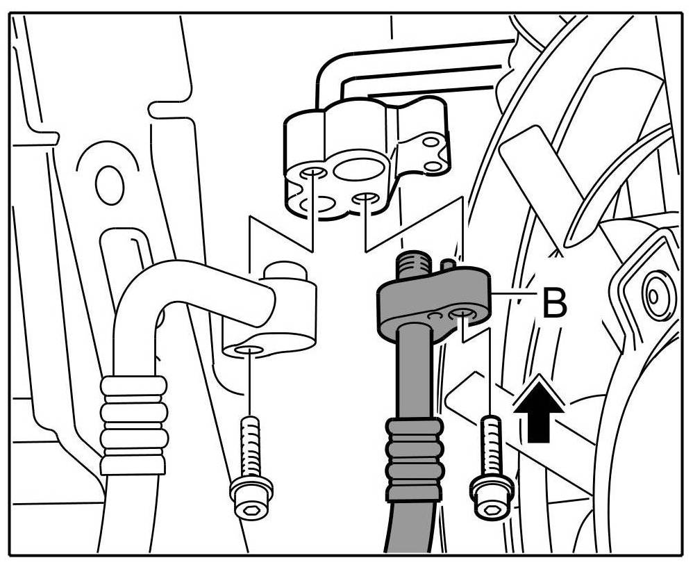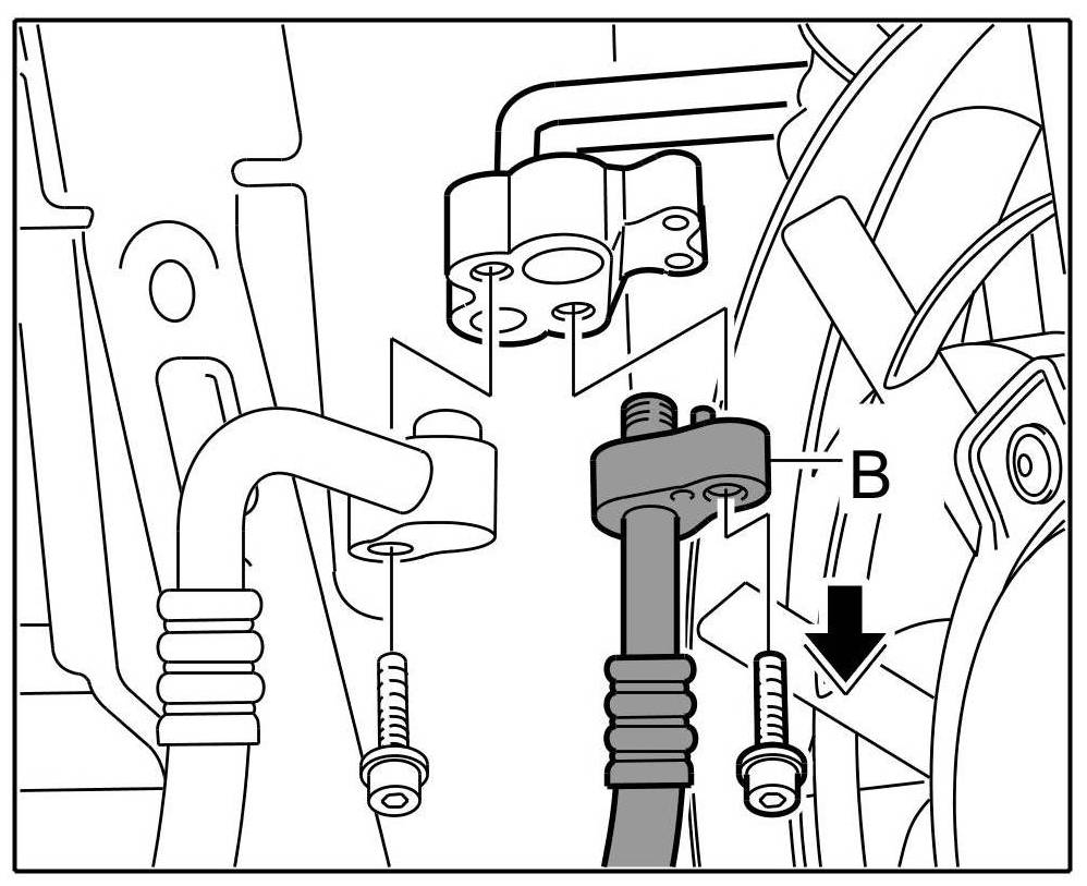 10. Insert refrigerant line -B- into the condensor and screw it in using the fastening screw on the condenser. => Tightening torque: 9 ftlb.