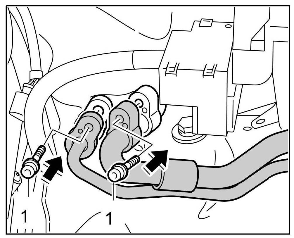3. Attach the refrigerant lines in the engine compartment to the connections (do not tilt) and screw down using the fastening screws -1-. => Tightening torque: 9 ftlb.