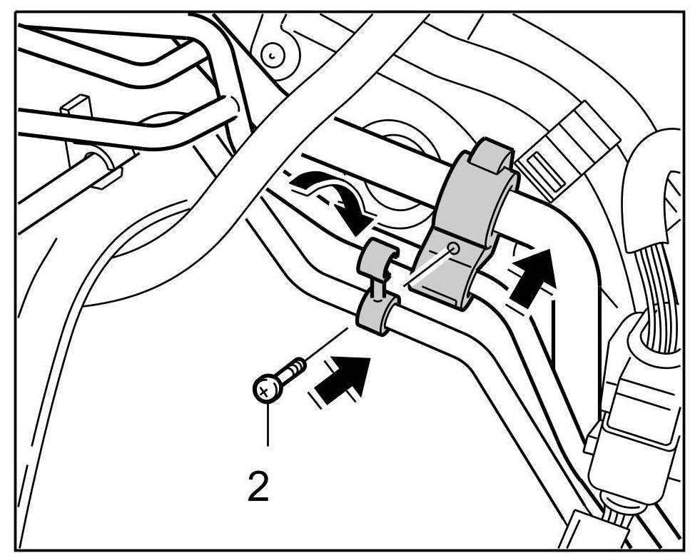 8. Engage the refrigerant lines in the holder on the wheel arch, close them, and screw down using the fastening screw -2-. => Tightening torque: 1 ftlb.