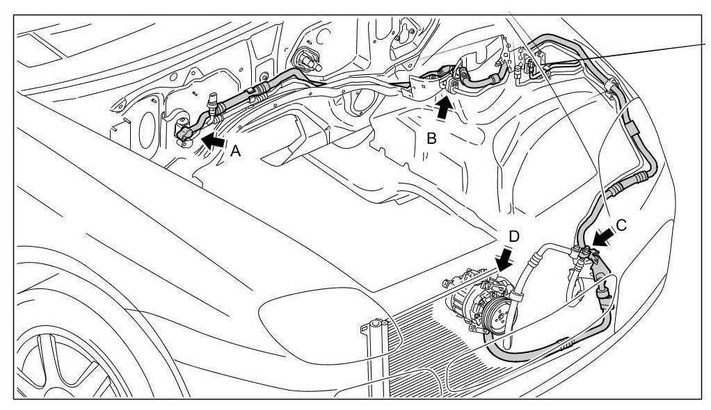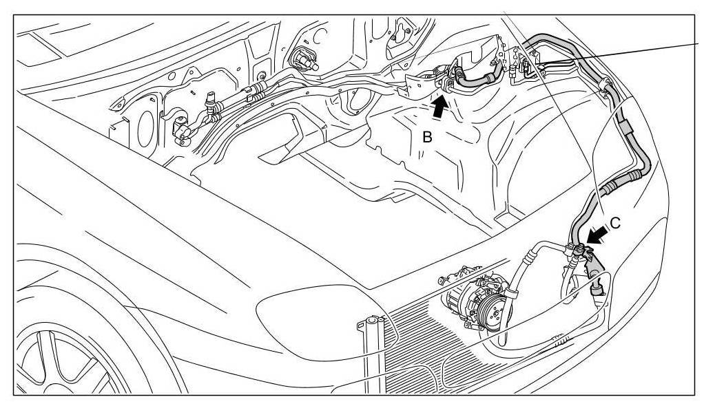 1. Insert the refrigerant line from below into the engine area onto the air conditioning compressor.